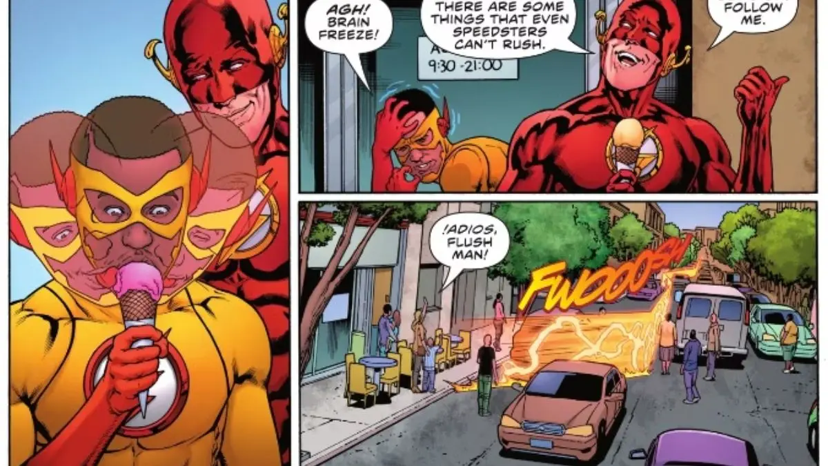 This next entry is a double delight because Wally West indulges in both ice cream and Chicago-style pizza in the same issue! In The Flash #781 by Jeremy Adams, Fernando Pasarin, and Matt Ryan, Wally takes his cousin, Ace West (a.k.a. Kid Flash), on an action-packed speedster day out. One of their first stops? An ice cream shop in Argentina, run by Wally’s friends Agus, Mario, and Kyle.