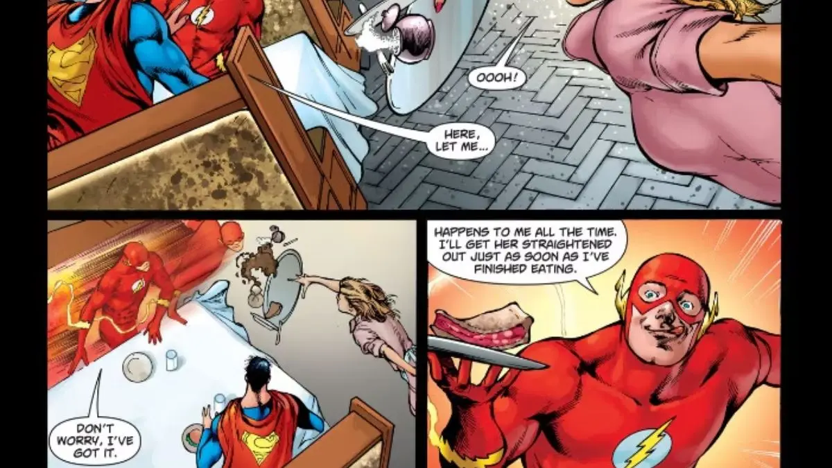 The Flash doesn’t just stick to hearty meals—he’s got a sweet tooth, too! In Superman #709, written by J. Michael Straczynski and Chris Roberson, with art by Eddy Barrows and Allan Goldman, Barry Allen and Superman stop by a local diner for a quick break.